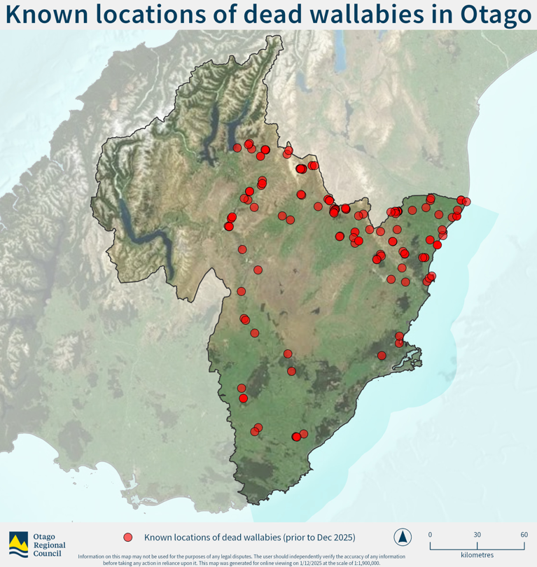This map shows known locations of dead or controlled wallaby in Otago between 2012-2025.