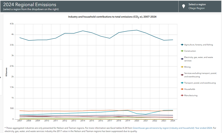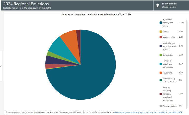 Nationally, Aotearoa New Zealand's major sources of greenhouse gas emissions are agriculture, manufacturing, households and transport/warehousing.