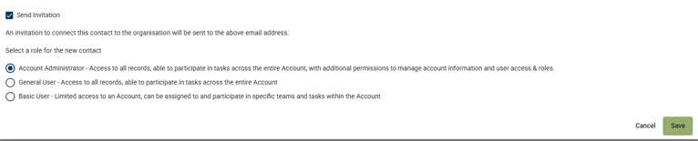 You have the option to give the new contact different user rights, amongst account administrator, general user and basic user.