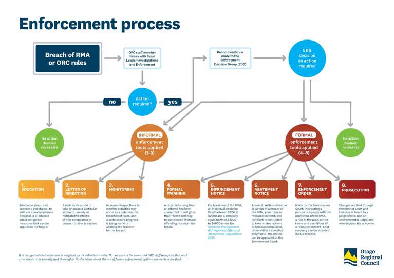 If the rules are broken and the environment is harmed, we have the options shown in the "Enforcement Process" flowchart.