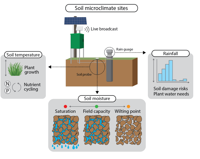 We have a network of soil microclimate sites in the region equipped with soil moisture and temperature probes and rainfall gauges. Live data is broadcast to the Environmental Data Portal, and can be used to decide when to irrigate or apply effluent and to monitor drought and flooding potential. We are currently expanding and improving the network.