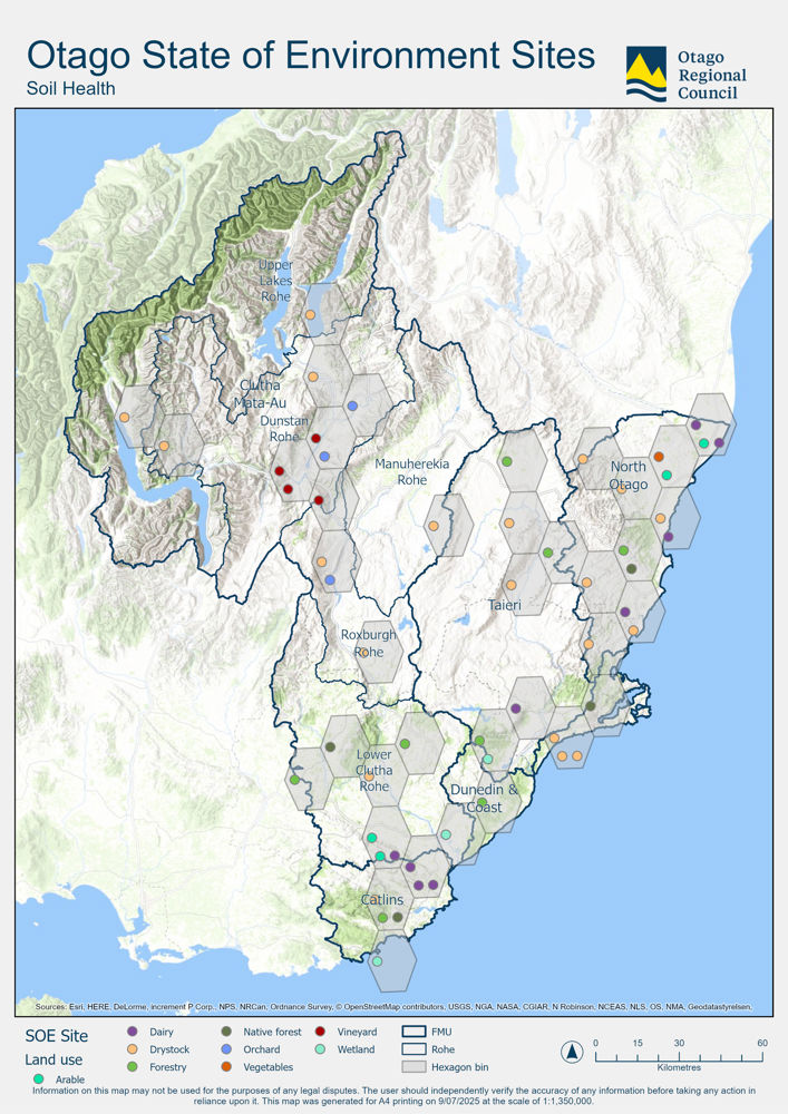 Locations across Otago were chosen to represent the different soil ordersland uses and other characteristics of our region (climate, geology, slope, elevation, vegetation cover). These locations are re-visited every five years to track changes over time.