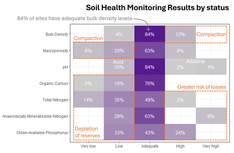 Fig. 2 Heatmap of the proportion of the total primary industry land uses included in the soil health monitoring programme (n = 49) that meet the statuses for each soil parameter and what soil issues these statuses are generally indicative of. Native Forests (n =4) and Wetlands (n = 3) are excluded as these are considered to represent ecosystems in natural states and not primary industry activities.