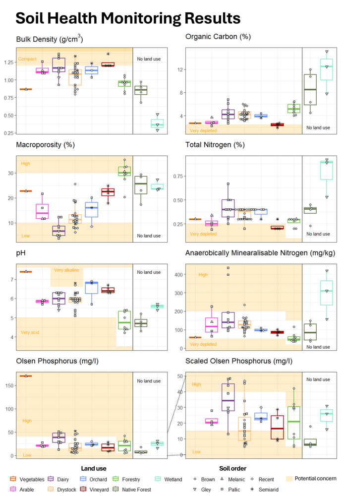 Boxplots of the land uses (Drystock n=20; Dairy n=9; Forestry n=8; Arable n=4; Vineyard n=4; Native Forest n=4; Orchard n=3; Wetland n=3; Vegetables n=1) with points representing New Zealand Soil Classification soil orders.