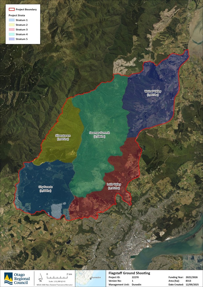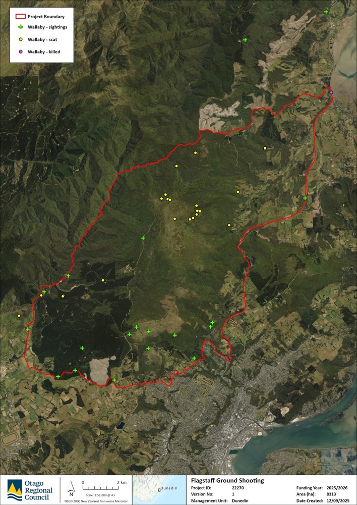 In response to the continued presence of Bennett’s wallaby in the Flagstaff/Swampy Summit area, ORC have engaged Rentokil Initial Ltd (High Country Contracting) to undertake control operations across the 5 areas, beginning October 2025 with City Forests (area 1).