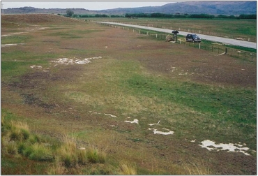 Description: A moderately large saline site near the Upper Taieri River consisting of small bare salty areas at the base of surrounding hillsides. On farm land adjacent to Styx-Patearoa Road 1