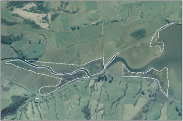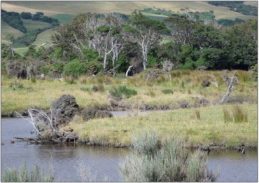 Description: A large area of shrub wetland, with kahikatea (Dacrycarpus dacrydioides) and silver beech (Nothofagus menziesii) remnants, on either side of the lower Catlins River. 1