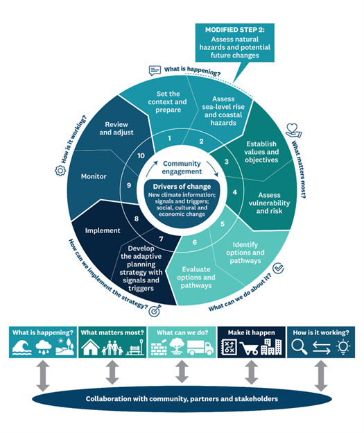 ORC is using the ‘Adaptation Pathways’ approach developed by the Ministry for the Environment, as outlined in the Coastal Hazards and Climate Change Guidance 2024, as a blueprint for community-led decision making in areas affected by natural hazards and climate change. ORC is also using this approach in other places around the region affected by natural hazards and climate change including the Head of Lake Whakatipu and South Dunedin.