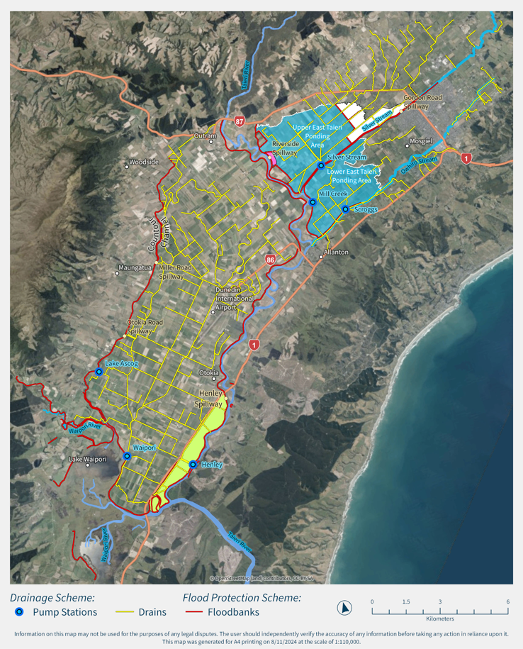 The West Taieri Drainage Scheme drains part of the Lower Taieri Flood Protection Scheme – the area bounded by the Taiari/Taieri River, Lake Waipori and the West Taieri Contour Channel. A small part of the scheme lies in the Henley Floodway.