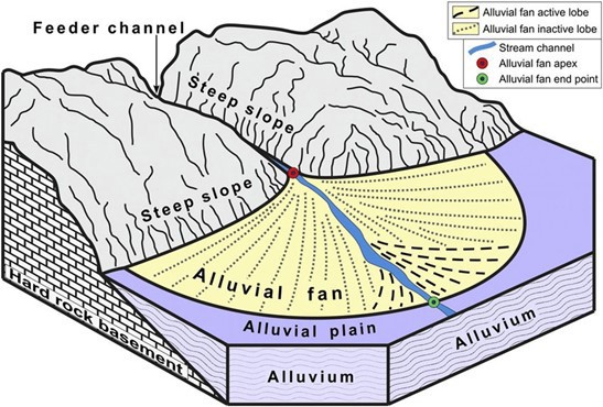Alluvial fans are landforms built up over time by material washing down from the hills. The diagram below shows an alluvial fan: