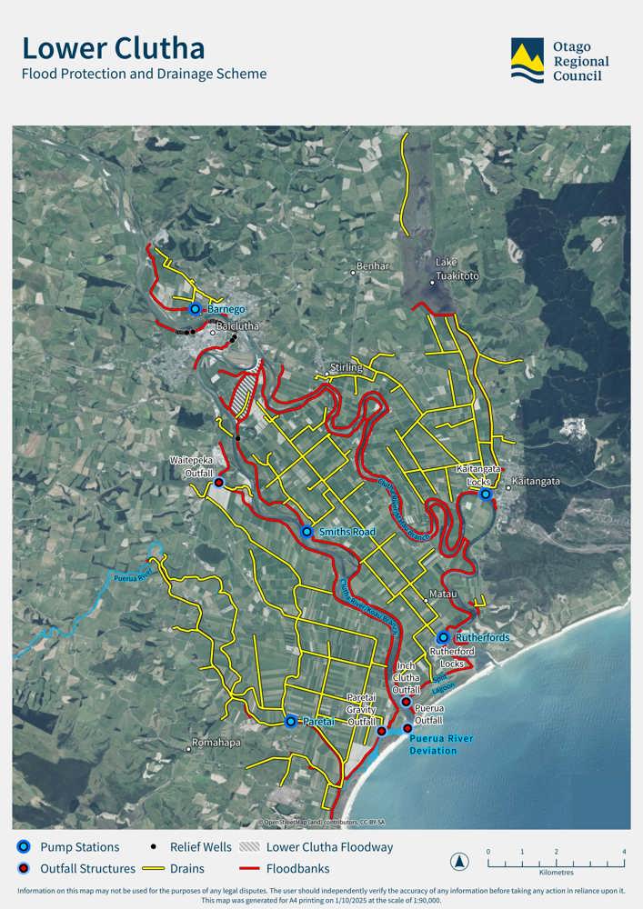 Water also flows into the delta from other sources, including Lovells Stream and Lake Tuakitoto, Waitepeka River, Puerua River and Barrata Creek. The scheme has a network of 153km of drains in four regions: Barnego, Stirling/Kaitangata, Inch Clutha, and Otanomomo/Paretai. The ORC doesn’t own or operate drainage in Balclutha and Finegand.