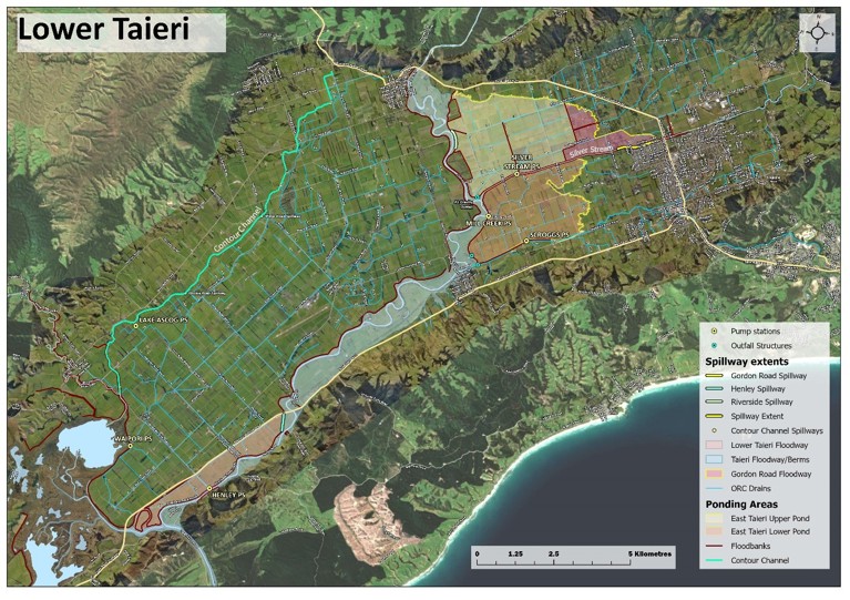 The West Taieri Drainage Scheme drains part of the Lower Taieri Flood Protection Scheme (above) – the area bounded by the Taieri River, Lake Waipori and the West Taieri Contour Channel. A small part of the scheme lies in the Henley Floodway.