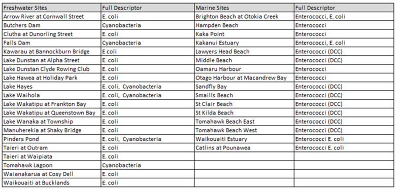 Water monitoring sites are reviewed annually, with 36 sites this year being tested weekly by ORC water monitoring staff (see table below). Freshwater sites are monitored for E. coli, marine sites for Enterococci, and lakes for cyanobacteria (toxic algae) to make sure water is safe for swimming.