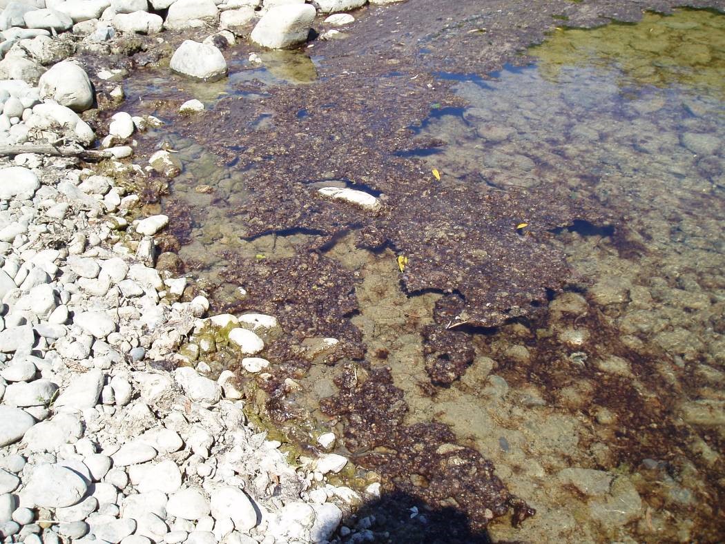 In lakes, toxic algae appears as green “pea soup” or scums on the surface of the water. In rivers, toxic algae occurs as dark brown or black mats attached to rocks, often with a musty smell. These mats can detach and form in floating rafts at the water’s edge or wash up on banks where risks to dogs and children are highest.