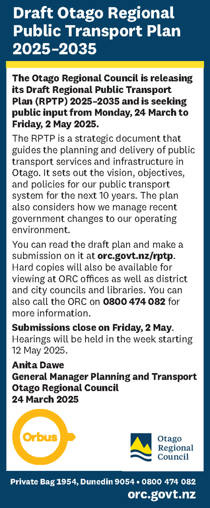 The Otago Regional Council is releasing its Draft Regional Public Transport Plan (RPTP) 2025–2035 and is seeking public input from Monday, 24 March to Friday, 2 May 2025.