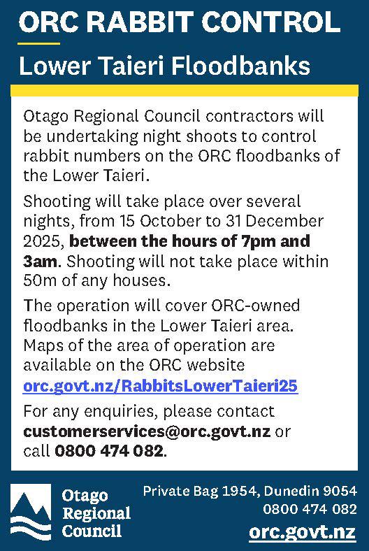 The operation will cover ORC-owned floodbanks in the Lower Taieri area. Maps of the area of operation are available on the ORC website orc.govt.nz/RabbitsLowerTaieri25