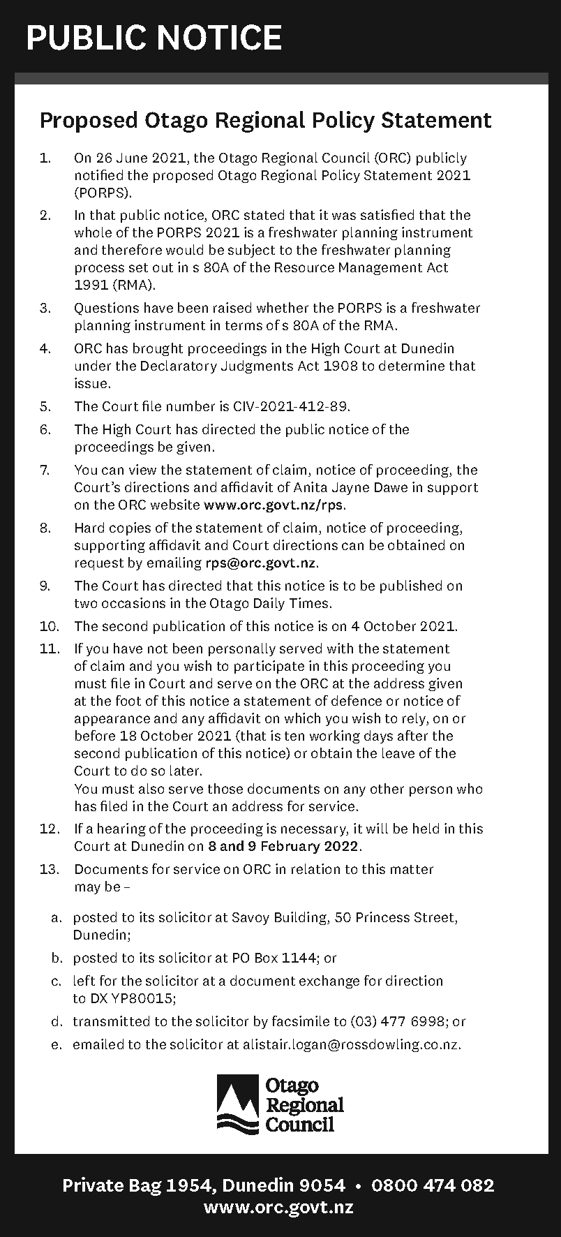 ORC brought proceedings in the High Court in Dunedin under the Declaratory Judgments Act 1908 to determine whether the proposed ORPS 2021 is a freshwater planning instrument in terms of section 80A of the Resource Management Act.